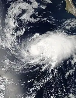Due to the storm's large size,[29] a "green" alert (low risk) was issued for the states of Colima, Jalisco and Michoacán while a "blue" alert (minimum risk) was placed into effect for the states of Nayarit, Guerrero,[30] and Baja California Sur.[31] As the system passed through the Revillagigedo Islands, winds reached 42 mph (68 km/h) on Socorro Island.[32] The outer rainbands brought moderate rains to Guerrero,[33] causing minor flooding in Acapulco. Across the state, the storm generated 24 landslides,[34] which blocked highways.[33] Two people were killed in the Guerrero, one a tourist that drowned in Zihuatanejo[35] and the other a police officer in an airplane crash that injured 19 others.[36] High seas flooded numerous buildings across coastal towns in Colima,[37][38] damaging 34 tourist facilities and killing one person.[39] Additionally, many restaurants built of wood and coconut were damaged. In Manzanillo, the port was closed to small craft,[40] as was the port of Mazatlán.[41] Overall, 50 homes were damaged by the storm.[42]