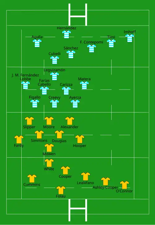 | Try: Folau 27' m Pen: Lealiifano (3/5) 11', 16', 40' | Report[16] | Try: Leguizamón 64' c Con: Hernández (1/1) 65' Pen: Sánchez (2/3) 7', 60' |