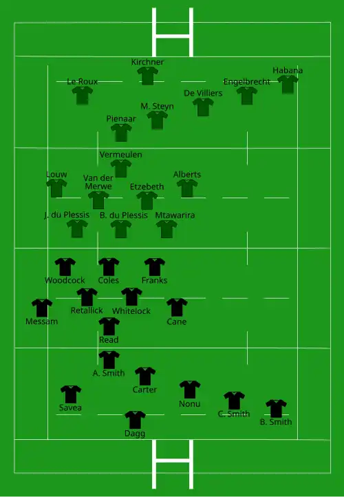 | Try: Penalty try 29' c Engelbrecht 32' c Strauss 45' c Alberts 52' m De Villiers 55' c Du Preez 62' c Habana 65' c Vermeulen 69' c B. du Plessis 75' c Con: Steyn (8/9) 30', 33', 47', 55', 63', 67', 70', 76' Pen: Steyn (4/4) 5', 9', 18', 37' | Report[7] | Try: Contepomi 79' c Con: Contepomi (1/1) 80' Pen: Contepomi (2/2) 16', 22' |