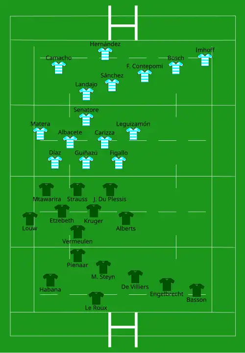 | Try: Leguizamón 1' c Bosch 36' c Con: Contepomi (2/2) 2', 37' Pen: Contepomi (1/2) 10' | Report[10] | Try: Basson 13' c Con: Steyn (1/1) 14' Pen: Steyn (5/5) 8', 40', 45', 71', 80' |