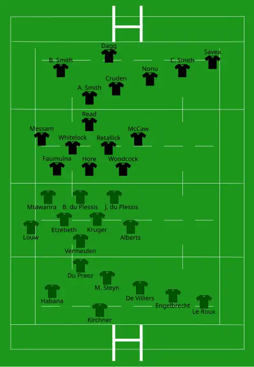 | Try: Read (2) 3' c, 45' c Retallick 21' c Cane 67' m Con: Carter (1/1) 4' Barrett (2/3) 22', 46' Pen: Barrett (1/2) 34' | Report[15] | Try: B. du Plessis 31' c Lambie 75' m Con: Steyn (1/2) 32' Pen: Steyn (1/2) 9' |