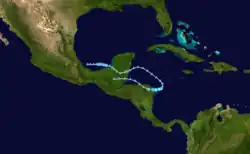 An area of low pressure interacted with an atmospheric Kelvin wave, leading to the formation of a tropical depression in the Bay of Campeche at 18:00 UTC on August 31. Six hours later, the depression was upgraded to Tropical Storm Dolly. Steered generally westward by a mid-level ridge to its north, the cyclone struggled with strong wind shear and reached peak winds of 50 mph (80 km/h) at 12:00 UTC on September 2. At 04:00 UTC the next day, Dolly moved ashore just south of Tampico, Mexico, with winds of 45 mph (70 km/h). Following landfall, the mountainous terrain of eastern Mexico quickly caused the cyclone to degenerate into a remnant low at 12:00 UTC on September 3. The post-tropical low continued westward prior to dissipating the next day.[58]