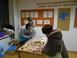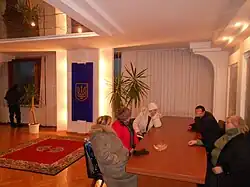 Activists in Lviv announced they would partially vacate the RSA to allow local officials to work,[91] but keep up barricades;[92][93] infighting ensued between activists and members of Svoboda over control of the building,[94][95] which remained occupied.[96] Protesters occupying the RSA in Chernihiv agreed to withdraw from the building after deputies agreed to support the demands of the opposition; a statement was made by both opposition and ruling government politicians supporting the removal of the anti-protest laws and amnesty for Euromaidan activists and political prisoners.[97][98] Thousands rallied and besieged the RSA in Uzhhorod,[99][100] which was barricaded by police from the interior.[100] Without taking the building, a People's Rada was democratically established by the Zakarpattia Regional Council, supporting the opposition.[101][102] Khmenlytskyi was further barricaded by opposition members to defend it from police.[80]