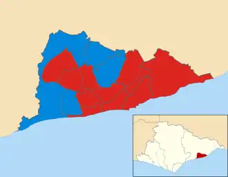 Map of the results of the 2014 Hastings council election. Labour in red and Conservatives in blue.