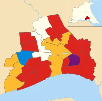 Map of the results of the 2014 Hull council election. Labour in red, Liberal Democrats in yellow, Conservatives in blue, UK Independence in purple, Uncontested in cream.