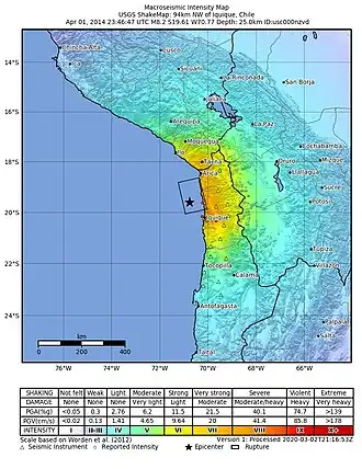 There was a cluster of earthquakes starting from the one occurring on 16 March with a magnitude of Mw 6.7, and a large earthquake had been expected.[8][9] The mainshock measured a moment magnitude of 8.1, according to the Global Centroid Moment Tensor (GCMT),[10][11] although the United States Geological Survey (USGS) put the magnitude at Mww 8.2.[1] This earthquake was smaller than what was expected, with a rupture of 200 km (120 mi) in length instead of the expected 600 km (370 mi) rupture.[12] The earthquake was felt in Chile, Peru, and Bolivia.[13] The intensity reached intensity VIII (Severe) in the city of Iquique.[14]