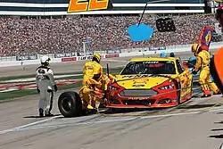 Joey Logano on pit road during the race. Logano would set a new track record during qualifying.