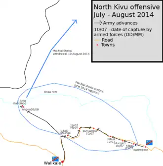 The operation was launched simultaneously from Walikale and Kashebere towards Kibua. By 3 July armed forces have already liberated Mungazi, Kibati and Ishunga in Luberi territory.[3] On 10 July army reported that Kibua and Bunyampuli have been recaptured. On 28 July MONUSCO spokesman claimed that army controlled Hihama and Utunda areas and mining area of Angoa.[4] On 4 August militiamen returned to the region following withdrawal of armed forces. On 8 August armed forces again launched offensive clashing with NDC in Angowa and Kabombo.[1] On 9 August armed forces captured Angowa on Walikale-Kisangani road.[5] On 10 August armed forces recaptured Kabombo. NDC militiamen have withdrawn north of Osso river towards Lubero territory.[6] Operation resulted in liberation of the Kashebere-Mpofi-Walikale axis including former stronghold of Buniyampuli and the Kibua-Pinga axis. 23 Mai-Mai Sheka fighters surrendered.[2]