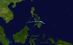 On January 10, the JMA reported that a tropical depression had developed, about 1,800 km (1,120 mi) to the southeast of Manila, Philippines.[9][10] The JMA expected the system to develop into a tropical storm within 24 hours, despite it being located in an area of marginal conditions for further development.[9][11] The JMA downgraded it back to a weak tropical disturbance on January 12, when convection became more disorganized.[12][13] Although its remnants crossed Mindanao, Philippines on January 13 and emerged into the area off the northeast coast of Mindanao on the next day.[14][15]