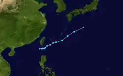 Early on April 27, the JMA reported that a tropical depression had formed about 420 km (260 mi) to the south-southeast of Hagåtña, Guam.[47] Later that day, the JTWC upgraded it to Tropical Depression 06W as it moved north.[48] Due to warm waters, the system rapidly intensified into a tropical storm with the JMA naming it Tapah on April 28.[49][50] Later that day, convection occurred and the system was upgraded to a severe tropical storm.[51] Early on April 29, the JTWC upgraded Tapah into a minimal typhoon.[52] It weakened back to a tropical storm during April 30.[47] During May 1, the system weakened into a tropical depression because of the effects of strong vertical windshear and a decrease in sea surface temperatures, before the JTWC issued their final advisory on the system.[47][53] The system was subsequently last noted by the JMA during the next day, as it dissipated over 1,300 km (810 mi) to the south-east of Tokyo, Japan.[47]