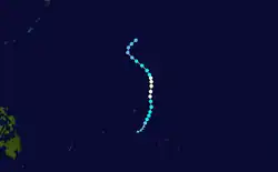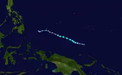 On February 27, the JMA started to monitor a tropical disturbance, that had developed, about 630 km (390 mi) to the south-southeast of Hagåtña, Guam.[28] During the following day, it was upgraded by the JTWC to a tropical depression, and designated as 03W.[29][30] Several hours later, the JMA upgraded the system to a tropical storm and named it Faxai.[31][32] Faxai began to rapidly intensify into a severe tropical storm, and then typhoon, for a short period of time on March 4.[33][34][35] The system transitioned into an extratropical cyclone during March 6, before it dissipated during March 8, while located around 800 km (495 mi) to the northeast of Wake Island.[28]