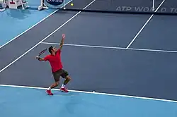After playing in the Davis Cup Federer took a three-week break and returned to competition at the Dubai Tennis Championships. Federer won his opening match against Benjamin Becker in the opening round with ease,[8] and faced Radek Štěpánek in the second round. After a solid first set by Federer, Štěpánek tied the match after winning the second-set tiebreak. Federer then climbed out of a three-game deficit in the third set, winning five straight games to seal the match.[9] In the quarterfinals, Federer played his first match against Lukáš Rosol of the Czech Republic. After having his serve broken in the first game, he won the next six games to clinch the first set and held his serve in the second to win the match in straight sets in just under an hour.[10] Federer faced defending champion Novak Djokovic in the semifinals, and dropped the first set to Djokovic. After a rain delay in the second set, Federer converted breaks in the second and third sets against Djokovic and won his first match against Djokovic in 18 months.[11] This was also the first time he had beaten Djokovic after dropping the first set. Federer then played Tomáš Berdych, who had beaten him in the semifinals last year. The two exchanged breaks in the first, but Berdych secured another break and won the first set. In the second set, Berdych broke Federer again, but Federer took advantage of errors on Berdych's part to get two breaks and level the match at one set all. Federer claimed a crucial break in a tighter third set, and held the lead to win in just under two hours. Federer won a record sixth Dubai title and won his 78th career title, surpassing John McEnroe for the third-most titles won in the Open Era. The win also ensured that he would continue his streak of winning at least one title per year since 2001.[12]