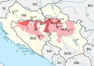 Croatia was affected by the floods to a lesser extent than Serbia or Bosnia.[47] The most critical area was in southern Slavonia. The embankment on the Sava River was breached near Rajevo Selo and Račinovci, and thus evacuation was ordered for Gunja, Rajevo Selo and Račinovci. As of 19 May, around 15,000 people in easternmost parts of Croatia were evacuated from their homes.[48] One of the most critical points was the embankment of the Sava river in Slavonski Šamac, where the confluence of the Bosna and Sava is located. At that point the embankments were under severe pressure caused by the huge amount of water coming from Bosnia. Several officials stated that if this embankment were breached, the entire region of southern Slavonia, with a population of over 300 000, would be flooded.[49] There were also floods in Banovina region, in the towns of Hrvatska Kostajnica and Dvor, mostly caused by the river Una, whose level had not been as high since 1955.[50] Video: http://vimeo.com/96164094