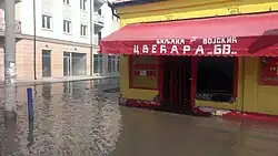 The city of Obrenovac was hit hardest by the floods, with an estimated 90% of the town flooded.[26] During the night between 15 and 16 May, nearby Kolubara river, collecting waters from southerly mountains, suddenly rose several meters above its banks and flooded the city, catching the residents by surprise. The entire city was evacuated.[27][28] During 18 May, the water level dropped, which enabled the evacuation of the citizens of Obrenovac to be carried out by trucks instead of boats.[29] As of 20 May the total number of evacuated persons exceeded 30,000.[30]