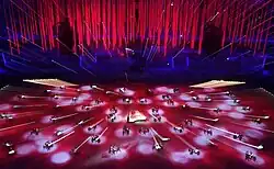 The ceremony continued with a number of "chapters" reflecting different aspects of Russian culture. First was a scene entitled "The World of Malevich, Kandinsky and Chagall" inspired by the paintings of Marc Chagall featuring brides, fiddlers, clowns and acrobats.[3] In the "Music" chapter, a grand piano arose from the stadium floor with pianist Denis Matsuev performing Rachmaninoff's Piano Concerto No. 2 followed by composers in white wigs and tails hitting the spotlight with 62 more pianos.[3][5] In the "Theatre" chapter, dancers demonstrated the ballet cultures of Moscow (Bolshoi) and Saint Petersburg (Mariinsky) to the music of Scheherazade by Nikolai Rimsky-Korsakov.[6][7] The First All-Russian Youth Symphony Orchestra accompanied the dancers.[3]