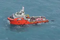 An offshore supply ship with the tail of PK-AXC on its stern on 10 January 2015