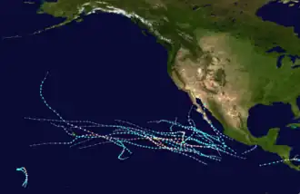 The 2016 Pacific hurricane season was tied as the fifth-most active Pacific hurricane season on record, alongside the 2014 season. Throughout the course of the year, a total of 22 named storms, 13 hurricanes and six major hurricanes were observed within the basin. Although the season was very active, it was considerably less active than the previous season, with large gaps of inactivity at the beginning and towards the end of the season. It officially started on May 15 in the Eastern Pacific (north of the Equator and east 140°W), and on June 1 in the Central Pacific (from 140°W to the International Date Line); they both ended on November 30.[1] These dates conventionally delimit the period of each year when most tropical cyclones form in these regions of the Pacific Ocean. However, tropical development is possible at any time of the year, as demonstrated by the formation of Hurricane Pali on January 7, the earliest Central Pacific tropical cyclone on record.[2] After Pali, however, no tropical cyclones developed in either region until a short-lived depression on June 6. Also, there were no additional named storms until July 2, when Tropical Storm Agatha formed, becoming the latest first-named Eastern Pacific tropical storm since Tropical Storm Ava in 1969.[3]