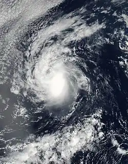 In the first two weeks of July, five low-pressure systems formed in the Eastern Pacific. The fourth of these was first noted by the National Hurricane Center on July 9; it was located in a favorable environment, and was expected to develop into a tropical storm.[57] On July 11, the low was upgraded into Tropical Depression Five-E.[58] On July 12, Five-E intensified into a tropical storm, and was assigned the name Darby; the next day it attained hurricane status.[59][60] It later strengthened into a Category 2 hurricane on July 15.[61] On July 16, despite traveling over cooler waters, Darby unexpectedly became a Category 3 hurricane.[62] However, 6 hours later, Darby weakened back to a Category 2.[63] Over the next four days, Darby gradually degraded over cooler waters as the storm moved westwards, towards Hawaii.[64] But, as it moved closer towards the area, it strengthened again, prompting several Tropical Storm warnings and watches to be issued for the Hawaiian Islands.[65] At 00:00 UTC July 24, it made landfall near Pahala of the Big Island.[66] Crossing the island as a minimal tropical storm, it was the first to do so since Hurricane Iselle in 2014. Slight weakening occurred as Darby traversed the island, however the storm retained minimal tropical storm strength as the storm began to move northwestwards.[67] On July 25, Darby was downgraded into a depression near Oahu and degraded into a remnant low 18 hours later.[68][69]