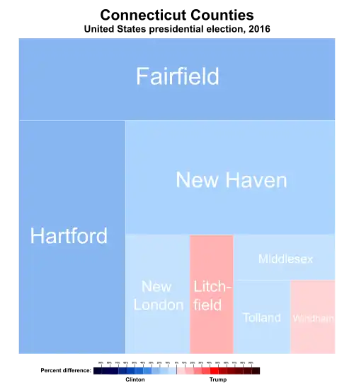 Clinton won the state by 13.64%, a smaller margin of victory than outgoing President Barack Obama's 17.33% in 2012.[2] Clinton carried six of the state's eight counties; however, Trump was the first Republican presidential candidate to win Windham County since George H. W. Bush in 1988. This is the first election since 1940 in which Connecticut did not vote the same as Michigan, something that would be seen again in 2024.