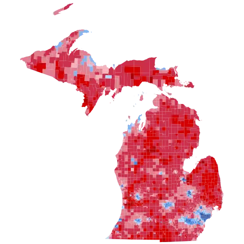 Prior to the election, Michigan was considered to be a state Clinton was favored to win. However, Trump unexpectedly won Michigan by a narrow margin of 0.23%, with 47.50% of the total votes over Clinton's 47.27%. This made Michigan 2.33% more Republican than the nation-at-large. The state was the last to be called by most major news networks due to the close nature and the need to count provisional and absentee ballots; most networks declared Trump the winner of Michigan's electors three weeks after Election Day.[4][5] This is the narrowest margin of victory in Michigan's history in presidential elections, as well as the narrowest margin of any state in the 2016 election. Trump's victory in Michigan was attributed to overwhelming and underestimated support from white working-class citizens in the state's rural areas, a demographic that had previously tended to either vote for the Democratic candidate or did not vote at all.[6] By winning Michigan, Trump became the first Republican presidential candidate to win the state since George H. W. Bush in 1988. Michigan also became one of eleven states to vote for Bill Clinton in 1992 and 1996 which Hillary Clinton lost.