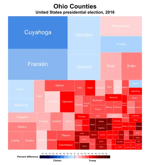 This was the first time since 1988 that Erie, Montgomery, and Portage counties voted for a Republican presidential candidate. Ashtabula County did so for the first time since 1984, and Trumbull County since 1972.[46] This is the last election in which Montgomery County voted for the Republican candidate, and the last in which Lorain and Mahoning County voted for the Democratic candidate.