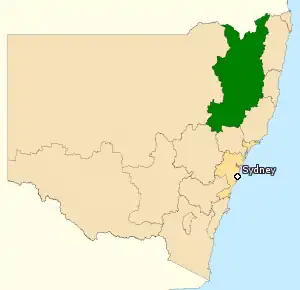 The Division of New England covers 66,394 km² in northern rural New South Wales. From south to north it includes the regional population centres of Scone, Tamworth, Armidale, Glen Innes, Inverell and Tenterfield.