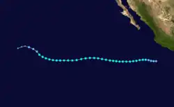 A low-pressure trough began producing disorganized convection over the waters of the Pacific Ocean, well to the south of Baja California Peninsula, on July 14.[54] Despite only marginally conducive environmental conditions, the disturbance began to show signs of organization two days later,[55] and it attained tropical depression status by 06:00 UTC on July 17.[56] Strong west-northwesterly wind shear confined the storm's intermittent bursts of convection well to the southwest of its low-level circulation, and the depression consequently failed to produce winds above 35 mph (55 km/h).[57] The system's center later degenerated into a low-pressure trough within the Intertropical Convergence Zone, prompting the NHC to discontinue advisories at 21:00 UTC on July 20.[58]
