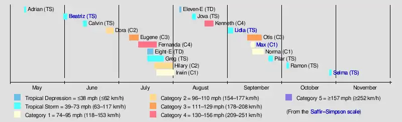 Although hurricane season in the eastern Pacific does not officially begin until May 15, and on June 1 in the central Pacific,[6] activity began several days prior with the formation of a tropical depression in the eastern region on May 9. This was the earliest formation of a tropical cyclone on record in the eastern Pacific basin proper,[7] until broken by Tropical Depression One-E in 2020. When it intensified into Tropical Storm Adrian a few hours later, the system became the earliest named storm on record in the region,[8] a record that stood until broken by Tropical Storm Andres in 2021.[9] Near normal activity occurred in June, with Tropical Storm Calvin formed on June 11, and Hurricane Dora on June 25.[10] For the third year in a row, July featured above average activity, with the fifth highest ACE value for that month on record.[11] This total was due to long-lived hurricanes Eugene, Fernanda, Hilary, and Irwin. August saw significantly less activity, with only three storms forming in the month; however it featured Hurricane Kenneth, the third major hurricane of the season. September featured four storms, including Hurricane Otis, which became the fourth major hurricane of the season. Only two storms formed after October 1, Ramon and Selma. Both did not attain hurricane status, though Selma became the first and last storm to make landfall in El Salvador. No systems were active in November for the first time since the 2010 season. The Accumulated Cyclone Energy index for the 2017 Pacific hurricane season as calculated by Colorado State University using data from the National Hurricane Center was approximately 100.7 units,[nb 5][12] about 20 percent near average.