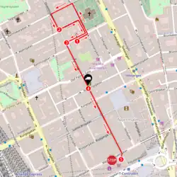 The hijacker then drove the truck at high speed into a pedestrian street, going about 500 meters down Drottninggatan, one of Stockholm's main shopping streets, hitting pedestrians along the way. Witnesses said the hijacker attempted to target children as he zigzagged on the street.[13] The attack ended when the truck slammed into the Åhléns City department store on the corner of Drottninggatan and Mäster Samuelsgatan. The truck caught fire, but the flames were quickly doused by firefighters. The hijacker jumped out and fled the scene.[14]