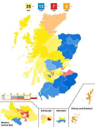 The Liberal Democrats gained the suburban constituencies of East Dunbartonshire and Edinburgh West on the outskirts of Glasgow and Edinburgh respectively. The party also regained their former heartland of Caithness, Sutherland and Easter Ross, a large rural constituency covering the northernmost parts of Great Britain, with Orkney and Shetland again becoming the safest Lib Dem constituency in the UK in vote share terms, with a majority 19.6% of the vote. They lost out to the SNP in the North East Fife constituency by just 2 votes (0.0%), the closest result in the United Kingdom at a general election since the result in Winchester in 1997.[30] However, the party's vote collapsed to the Conservatives in Aberdeenshire, the Borders and in parts of the Highlands.