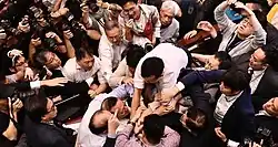 Attempts to hold meetings on 11 May descended into chaos as the rival factions pushed and shoved each other along the packed hallway for control of the meeting room. A number of legislators fell to the ground, including Gary Fan who fell from a table before he was sent to hospital.[43] On 14 May, the meeting with two rival presiding chairmen descended into chaos again. Subsequently, pro-Beijing presiding chairman Abraham Shek announced that he could not hold a meeting and asked the House Committee for guidance.[44] On 20 May, Secretary for Security John Lee announced that the government would resume the second reading of the bill in a full Legislative Council meeting on 12 June, bypassing the usual practice of scrutinising the bill in the Bills Committee.[45] After a five-hour meeting on 24 May, the House Committee of the Legislative Council dominated by the pro-Beijing camp passed a motion in support of the government's move to resume the second reading of the bill at a full council meeting on 12 June.