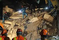 Collapsed apartments accounted for nearly all 117 deaths in Turkey. Among the deadliest collapse involved the Rıza Bey Apartment, where 38 people died.[53] Only one death occurred outside İzmir.[9] The other Turkish victim outside İzmir died from drowning in the advancing tsunami in the district of Seferihisar.[3] Two teenagers died in Greece after being crushed by a wall on the island of Samos; 19 others were injured in Greece.[6] These were the first earthquake-related fatalities in Greece since 2017.[54]