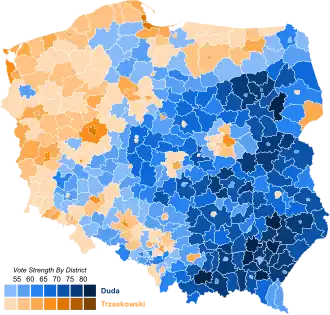 Presidential elections were held in Poland on 28 June 2020. As no candidate received a majority of the vote, a second round was held on 12 July, in which incumbent president Andrzej Duda, running with the support of the incumbent government of the Law and Justice (PiS) party,[1] faced off against Civic Platform vice-chairman and Mayor of Warsaw Rafał Trzaskowski. In the second round Duda was re-elected for a second term with 51% of the vote, becoming the first incumbent to win re-election since Aleksander Kwaśniewski in 2000.