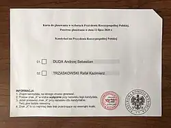 On 29 April 2020, 11 days before the planned election date, election candidate Stanisław Żółtek presented a copy of an electoral ballot at a press conference.[25][26] The copies contained the names of all the candidates and other forms to be filled by voters. Żółtek said that he received the ballots from workers of one of the companies that was printing and preparing electoral documents. Poczta Polska notified the Internal Security Agency about the leak. As of 2 May 2020, Polish law did not authorise Poczta Polska to organise postal voting except in a small number of special cases.[25]