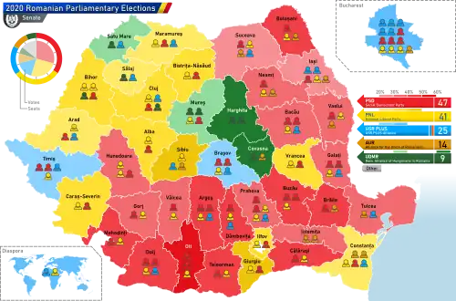 - ^ Novăceanu, Alina; Iacob, Simona (9 December 2020). Tănăsescu, Georgiana; Pandea, Răzvan-Adrian (eds.). "ParliamentaryElection2020/BEC-final results:Senate: PSD 29.32%, PNL 25.58%; Chamber of Deputies: PSD 28.90%, PNL 25.19%". AGERPRES. Archived from the original on 16 December 2020. Retrieved 9 December 2020.