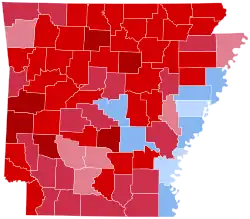 Prior to the election, all 14 news organizations making predictions considered this a state Trump would win, or otherwise a safe red state. In 2016, Trump won Arkansas by a 26.92% margin,[4] the largest margin for a candidate of either party since Jimmy Carter's 30.01% margin in 1976. In 2020, Trump won 62.40% of the vote to Biden's 34.78%, a 27.62% margin,[5] the seventh consecutive election in which Republicans improved on their margin in Arkansas, the longest in the nation of any state for either party.[6] This made Arkansas one of only six states, along with the District of Columbia, in which Trump improved on his performance in 2016.[a] Despite improving on Hillary Clinton's performance in the Natural State by 1.13% in terms of raw vote percentage, Biden's losing margin makes it the largest loss by a Democrat in Arkansas since George McGovern's 38.1-point defeat in 1972. The last Democrat even to win over 40% of the vote was John Kerry in 2004.[6] After Barack Obama, Biden is the second ever Democrat to win the presidency without carrying Arkansas. This was the first time ever that an incumbent Republican carried the state while losing re–election.