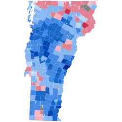 Biden easily emerged victorious in the Green Mountain State 66.09% to 30.67%, a margin of 35.4%. This is the first time Vermont was the strongest state for either party since 1956, when it was Republican Dwight D. Eisenhower's best state. Vermont also saw the largest increase in turnout from 2016, increasing 14.3%.[4] Biden greatly improved on Hillary Clinton's 55.7% vote share and 25.9% margin from 2016, when third-party candidates received over 14% of the vote; with an improvement of 9% in the margin of victory, this marked the strongest leftward shift any state experienced in 2020.[5] Biden's performance was also the fourth-strongest Democratic performance in state history, as well as the third-largest Democratic margin of victory. Trump carried only one county, sparsely populated Essex bordering New Hampshire, which had voted for the winner from 1980 to 2016. Consequently, Biden became the first president to win without the county since Jimmy Carter in 1976.