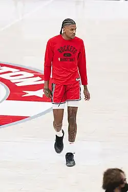 NBA player Jalen Green wearing 5-inch inseams, crew socks, and visible boxer briefs—a common early 2020s style choice.