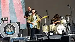 From 2023 to 2024, the predominant colours in Britain, Australia, France and America were red, white[283] and blue.[284] As in the mid-to-late 1970s, Western shirts with pearl snaps in denim, black gabardine or bright madras plaid made a comeback, and sometimes featured contrasting yokes[285] and cuffs with intricate embroidery.[286][287] Moccasins, stonewash denim waistcoats with decorative fringes, preppy loafers, navy blue suits and sportcoats, Wrangler jeans[288] or Levi Strauss jeans,[289] suede fringe jackets popularized by Pharrell Williams, Noel Fielding, Post Malone and Beyonce in anticipation of the release of her Cowboy Carter album,[290] straight leg jeans instead of the skinny jeans fashionable from the late 2000s until the mid-2010s,[291] stetsons, white baseball jerseys with bold red or blue pinstripes, striped blue neckties, baggy white pants, Union Jack motifs, Panhandle Slim, Rockmount and Scully sportcoats with contrasting Western-inspired yokes and embroidery,[292] barrel jeans, duster coats as worn in the Yellowstone TV series,[293] preppy style college sweaters, retro blue and white striped football shirts,[294] chelsea boots with cowboy boot styling, two-button blazers with red and blue boating stripes, V-neck sweater vests, royal blue baseball jackets with white sleeves, Howler Brothers gilets,[295] shirts and suits worn open to expose the chest,[296] and boxy leather reefer jackets were popular on both sides of the Atlantic.[297][298]