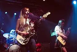 VSCO girl is an American clothing style that tried to emulate the style of the photo app, VSCO. These girls wear scrunchies on their wrists and in their hair with high-side ponytails and headbands. Footwear includes white sneakers, ballet flats, and sandals. They wear either no makeup or little makeup that blends with their skin and prioritizes a cute and comfortable style.[323] Popular e-girl options include high-waisted pants, oversized tie dye T-shirts, long sweatshirts or sweater dresses, bike shorts, Nike track shorts, Nike Tempo shorts, capri and ankle length leggings with socks,[324] T-shirt dresses, denim skirts, overalls, shortalls, high-waisted mom jeans, shirts, sweaters, sweatshirts tucked in their jeans and a belt, headbands, and Nike Elite socks in many different colours. Due to the extensive mockery and overexposure this subculture endured on TikTok, the term VSCO girl became quickily phased out of popular culture despite the clothing's continued popularity throughout the decade.[325][326][327][328][329][330]