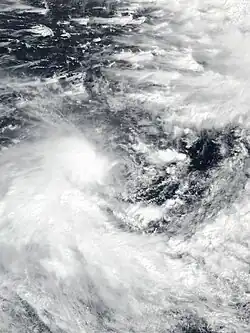 On 11 April, a low-pressure area evolved near the southeast coast of South Africa from the interaction of an upper-level trough and warmer air near the surface. With warm ocean temperatures and low wind shear, the low developed intense thunderstorms which wrapped around a tight circulation, and dropped heavy rainfall in eastern South Africa. On 12 April, the MFR designated the low as Subtropical Depression Issa, based on the system's structure and the presence of gale-force winds. Issa moved slowly to the south at first,[124] strengthening to reach 10-minute sustained winds of 95 km/h (60 mph) late on 12 April. At its peak, the storm had an eye-like feature in the middle of a symmetrical area of thunderstorms.[125] On 13 April, the JTWC classified this system as a subtropical storm in an unofficial bulletin.[126] Issa turned to the north back toward the South African coast due to the trough in the region.[127] Increased wind shear and dry air stripped away the thunderstorms near the center, weakening the storm, and causing the MFR to discontinue advisories on 13 April.[128]