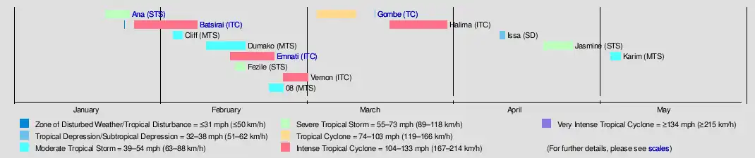 Yet another storm, Cyclone Emnati, would strike extreme southern Madagascar as a Category 1-equivalent after peaking as a Category 4-equivalent beforehand. The third Intense Tropical Cyclone, Cyclone Vernon, passed into the basin as a Category 4-equivalent after very rapidly intensifying in the neighboring Australian region. The fourth Intense Tropical Cyclone, Gombe, formed off the coast of Madagascar on 5 March. Initially, the storm struggled to intensify beyond tropical storm status. After hitting Madagascar, Gombe emerged into the Mozambique Channel and rapidly intensified to a Category 3-equivalent cyclone. It then struck Mozambique, bringing heavy rainfall to the same area which Ana had hit a few weeks ago. After Gombe, Halima formed in the northeast of the basin on 21 March. It gradually intensified to an Intense Tropical Cyclone on 25 March, before dissipating later on 1 April. After, Subtropical Depression Issa formed just off the eastern coast of South Africa, an extremely rare phenomenon. It proved itself to be damaging and very deadly, killing hundreds due to catastrophic flooding. Finally, Jasmine formed near Comoros on 21 April before the landfall in Nampula and Zambezia province off the coast of Mozambique and rapidly intensified as Severe Tropical Storm. The storm made landfall in Toliara before it rapidly weakening to an overland depression, and dissipated on 27 April. In early May, Karim formed. Karim did not affect land and entered the Australian region on 7 May.