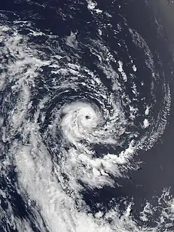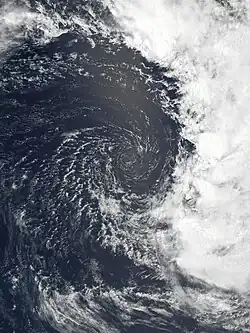 On 5 January, the FMS began monitoring a tropical disturbance near Fiji, designating the system as 03F.[21] Later that day, the Joint Typhoon Warning Center (JTWC) began monitoring 03F, though its development was inhibited due to wind shear.[22] The system's chances of developing increased,[23] and on 8 January, the JTWC issued a Tropical Cyclone Formation Alert for 03F.[24] On the same day at 21:00 UTC, the JTWC upgraded 03F to a tropical depression, assigning it the designation 05P.[25] 03F briefly weakened on the next day; however, it reorganized, with a satellite scatterometer pass showing winds of 35 knots (65 km/h; 40 mph) prompting the JTWC to upgrade it to a tropical storm.[26] On 10 January, the FMS upgraded 03F to a Category 1 cyclone on the Australian scale and assigned it the name Cody. The FMS estimated peak 10-minute sustained winds of 130 km/h (80 mph), with the JTWC estimating peak 1-minute sustained winds of 95 km/h (60 mph). The JTWC assessed that Cody transitioned into a subtropical cyclone on 11 January,[27] with the FMS issuing its last advisory for Cody late on 12 January.[28]