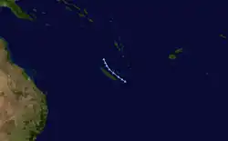 On February 4, the United States Joint Typhoon Warning Center reported that a tropical disturbance had developed within the Australian region about 1,285 km (800 mi) to the west of New Caledonia.[31] The disturbance was starting to develop a low-level circulation, which was accompanied by fragmented atmospheric convection, along a frontal boundary that extended across the Cape York Peninsula and the Coral Sea.[31] Over the next couple of days, the Australian Bureau of Meteorology (BoM) and the Fiji Meteorological Service (FMS) started to monitor the poorly organized system as Tropical Low 18U and Tropical Disturbance 08F, as it moved eastwards within the frontal boundary towards Vanuatu and the South Pacific basin.[32][33][34] During February 7, the system started to slowly consolidate, as it passed to the north of New Caledonia, before the FMS classified the system as a tropical depression.[35][36] At this stage, the depression was moving eastwards and was predicted to continue to move eastwards towards Fiji, however, the depression slowed down as it approached the islands of southern Vanuatu during February 8.