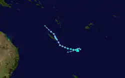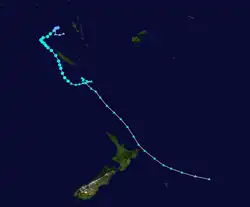 On December 13, Tropical Cyclone Ruby moved into the basin from the Australian region, as a Category 2 tropical cyclone on the Australian scale.[13][14] Late on the same day, it made landfall on New Caledonia, and weakened as it emerged from the country.[15] The FMS downgraded Ruby into a Category 1 tropical cyclone,[16] and the JTWC issued their final advisory shortly thereafter.[17] Ruby crossed into the MetService's area of responsibility, where it became an extratropical cyclone on December 15.[18]