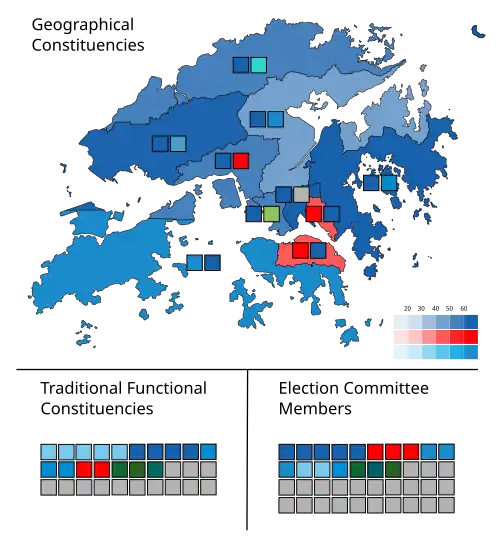 89 out of 90 elected members were the pro-Beijing establishment, with one sole moderate member in the mix represented by Third Side's Tik Chi-yuen.[15] The traditional flagship pro-Beijing party Democratic Alliance for the Betterment and Progress of Hong Kong (DAB) emerged as the biggest winner with 19 seats, by securing a seat in each of the ten geographical constituencies.[16]