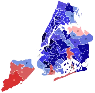 The 2021 New York City Council elections were held on November 2, 2021. The primary elections were held on June 22, 2021.[2] There were several special elections for seats vacated in 2020 and early 2021; these special elections were the first to use ranked-choice voting in city council elections after it was approved by a ballot question in 2019[3] and the second to use ranked-choice voting since New York City repealed PR-STV in 1945.[4] Due to redistricting after the 2020 Census, candidates also ran for two-year terms instead of four-year terms for the first time, stemming from the New York City Charter overhaul in 1989.[5] Four-year terms will resume in the 2025 election after another two-year election in 2023.