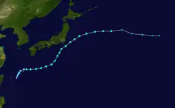 On May 27, the JMA and the JTWC noted the persistence of an area of atmospheric convection about 425 nautical miles (787 km; 489 mi) south-southeast of Guam.[57] The area's nearby environment exhibited low wind shear and warm sea surface temperatures, which were ideal conditions for tropical cyclogenesis.[58] The JMA assessed the area to have developed into a tropical depression on May 29 at 06:00 UTC.[59] The PAGASA made a similar assessment in a Tropical Cyclone Advisory issued at 15:00 UTC.[60] The JTWC later followed with their own assessment, identifying the center of the newly developed tropical depression and assigning the designation 04W.[61] As the system tracked westward, it entered the Philippine Area of Responsibility at 01:00 PHT (17:00 UTC).[62] The PAGASA then named the storm Dante in its first Tropical Cyclone Bulletin for the storm.[63] Dante further organized in the Philippine Sea,[64] and on May 30 at 15:00 UTC, the JTWC upgraded it to a tropical storm,[65] with the PAGASA doing the same at 21:00 UTC.[66] On the next day at 00:00 UTC, the JMA also upgraded Dante into a tropical storm, giving it the international name Choi-wan.[67] Choi-wan's center was exposed due to a tropical upper tropospheric trough from the northeast, inducing shear on the system.[68] On June 1 at 12:30 UTC, Choi-wan made landfall on Sulat, Eastern Samar as a minimal tropical storm,[69] with the JTWC downgrading it to a tropical depression at 15:00 UTC.[70] It made a second landfall on Cataingan at 17:00 UTC.[71] Choi-wan made several more landfalls on the Philippines, making its third landfall on Balud, Masbate at 19:30 UTC. It made a fourth landfall on Romblon, Romblon on June 2 at 00:00 UTC, a fifth on San Agustin, Romblon at 00:50 UTC, a sixth on Pola, Oriental Mindoro at 06:00 UTC, a seventh on Tingloy, Batangas at 11:20 UTC, and an eighth and final landfall on the Calatagan Peninsula before moving into the South China Sea.[72] On June 3 at 03:00 UTC, the JTWC upgraded Choi-wan back to a tropical storm.[73] At 03:00 UTC, the PAGASA removed all Tropical Cyclone Warning Signals as Choi-wan moved away from the country.[74] Choi-wan then exited the PAR on June 3 at 18:00 UTC[75] before weakening into a tropical depression on the next day at 06:00 UTC and re-entering the PAR at 08:00 UTC.[76] Then, it passed southeast of the island of Taiwan[77] before moving out near the Okinawa Prefecture and heading towards Japan. On June 5 at 06:00 UTC, the Japan Meteorological Agency issued their final advisory on the system.[78] 3 hours later at 09:00 UTC, the JTWC upgraded Choi-wan back into a tropical storm,[79] however at 15:00 UTC, the Joint Typhoon Warning Center downgraded the system to a tropical depression, also issuing their final advisory on the system.[80]