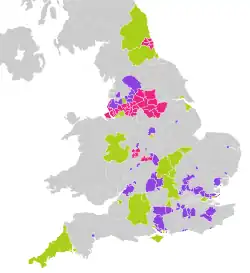 There were previously twenty-six county councils, but there will only be twenty-four by the time of the election. Buckinghamshire County Council was replaced with a unitary authority, Buckinghamshire Council, on 1 April 2020.[49] Northamptonshire County Council "declared itself effectively bankrupt" in February 2018[50] and two new unitary authorities, North Northamptonshire and West Northamptonshire replaced it on 1 April 2021.[51]