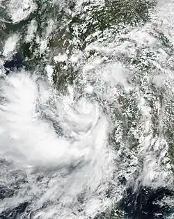 A fresh cyclonic circulation developed on early 19 May, over the Gulf of Martaban, due to the enhancement of the annual South-West monsoon over the basin.[44][45] By the evening, under the influence of that circulation, a low pressure system spawned over the same region.[45] At 18:00 UTC (23:30 IST), the JTWC also acknowledged that same circulation at the night of the same day.[46] By 00:30 UTC (06:00 IST) the JTWC published its TCFA for the system after it had rapidly consolidated its convective structure for the past few hours, and also formed a well-defined low-level center.[47] But eight hours later, the JTWC, cancelled it because its close proximity over land.[48] However, according to IMD, it rapidly consolidated into a well-marked low pressure area in the morning of the same day, and further into a depression at 11:30 IST (03:00 UTC), as it moved northeastwards, towards the south Burmese coast.[45] Between 08:00 UTC (13:30 IST) and 09:00 UTC (14:30 IST), the system made landfall over the southern Burmese coast, 30 km (20 mi) from Mawlamyine.[49] The system maintained its depression status as it travelled inland.[50][51] By 00:00 UTC (05:30 IST) the next day, the system finally weakened into a well-marked low pressure area over the Burma-Thailand.[52]